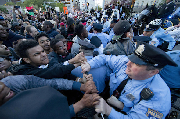 Protesters rush a police line after a rally at City Hall in Philadelphia. The event followed days of unrest in Baltimore over the death of Freddie Gray. (AP / Matt Rourke)