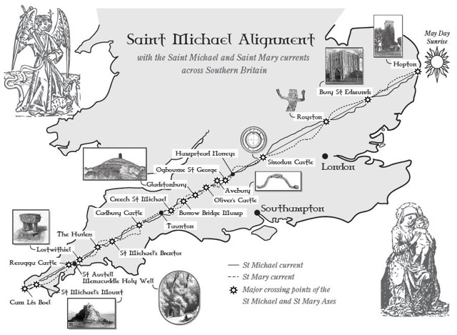England’s Saint Michael Line runs straight from Land’s End on the southwestern coast through Glastonbury 350 miles to Hopton-on-Sea on the Norfolk coast, following the path of the sun on May 8 (Beltane in the old days), St. Michael’s festival. It forms the hypotenuse of a triangle formed by the three most sacred sites in England: Glastonbury, Stonehenge and Avebury, the largest henge circle in the world, covering 28 acres.