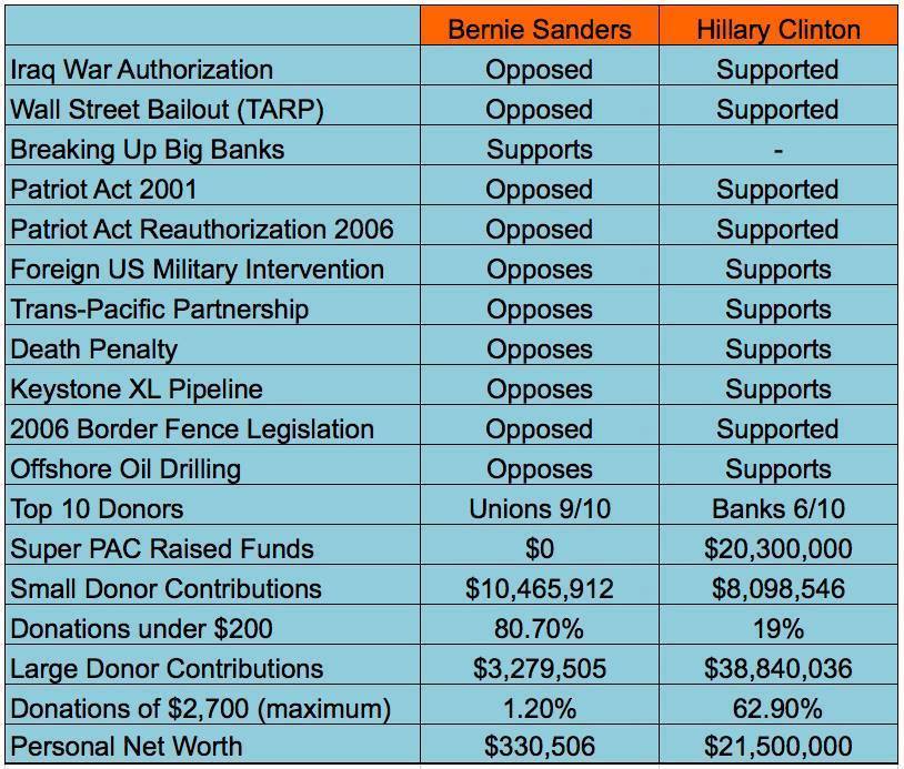 After a New York Times analysis found Bernie Sanders and Hillary Clinton voted in synch 93 percent of the time during their two overlapping Senate years, Sanders’ supporters have been pushing back on the notion that the two leading Democratic presidential candidates are largely the same. Vox Populi contributor John Samuel Tieman found this chart which is circulating on Twitter, Facebook and Reddit that attempts to differentiate Sanders and Clinton by highlighting differences in their voting records.