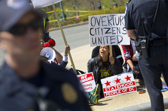 Actress Rosario Dawson, center, takes part in a demonstration on Capitol Hill in Washington, Friday, April 15, 2016. The demonstration, called Democracy Spring, is advocating a set of reforms the organizers have dubbed the ‘democracy movement’ demanding Congress amend campaign finance laws and restore the Voting Rights Act, among other actions. (AP Photo/Pablo Martinez Monsivais)