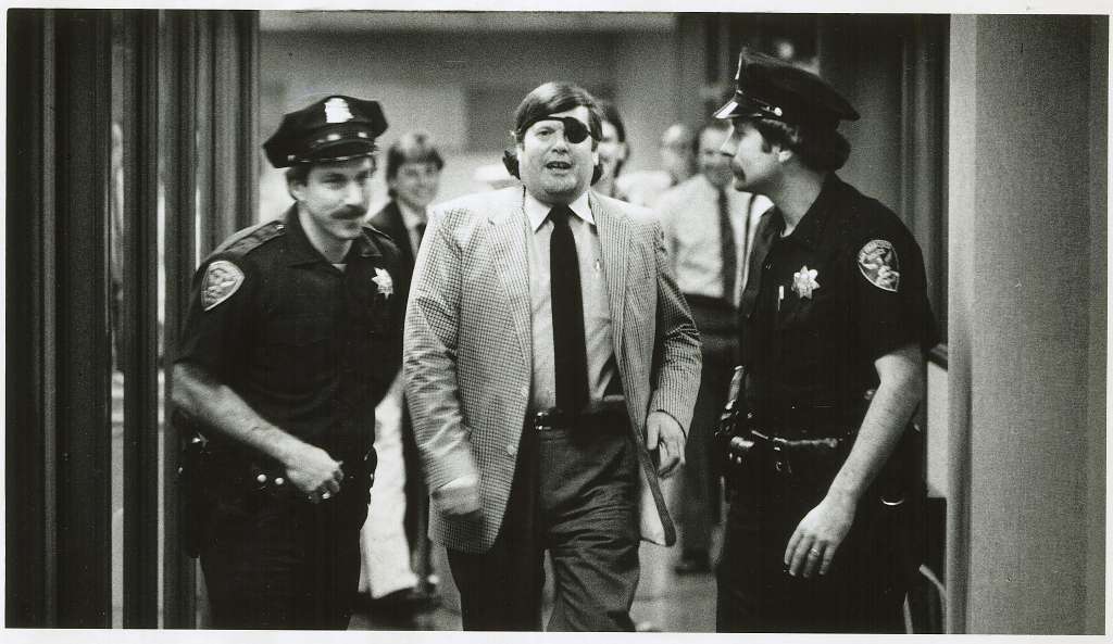 Warren Hinckle and police officers Marty Saco and Ross Laflin taking him out the Chronicle on Feb. 14, 1985.