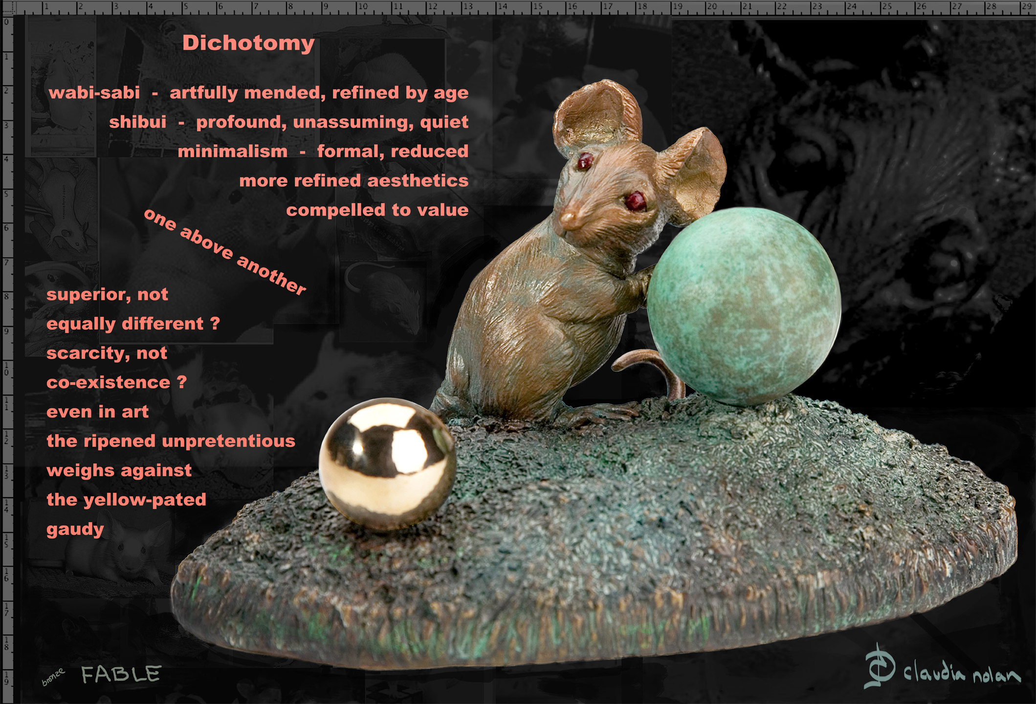 Ed. note: Claudia Nolan’s post is the perfect post-modern fable because the original narrative (something about a mouse who has to decide between a golden marble and a green one), if it existed at all, has been completely replaced by interpretation and commentary. Instead of the story, we have an image of a sculpture representing the story, notes in two languages on the political dialectic that the story represents, a few technical facts about the sculpture, and the artist’s statement of intent about the whole thing. And now you have this note by an editor who is as impressed and confused as you are. This is the meta-world in which we live, folks. Enjoy your little golden marble.