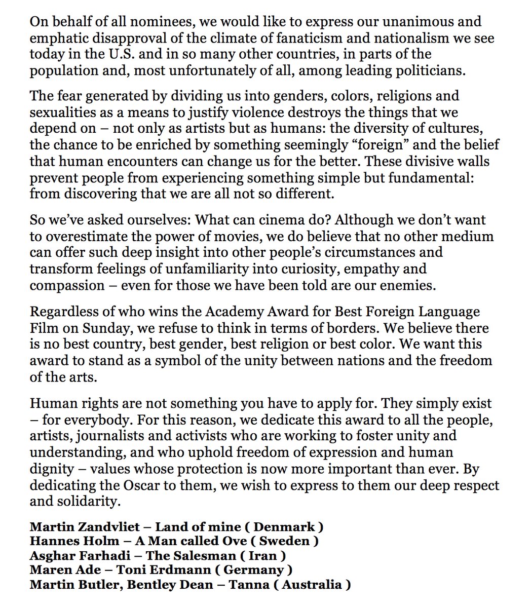 Farhadi was not blocked by Trump’s Muslim travel ban because the Court of Appeals had already blocked the implementation of the ban. Farhadi did not attend the Academy Awards in protest.