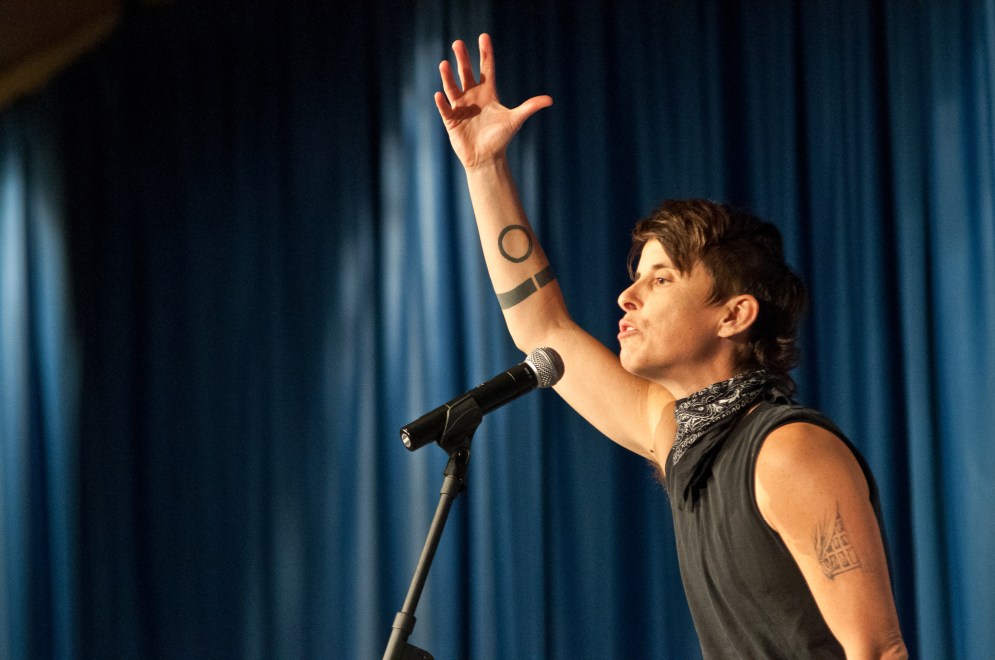 Andrea Gibson (born August 13, 1975) is an American poet and activist from Calais, Maine, who has lived in Boulder, Colorado since 1999. Gibson’s poetry focuses on gender norms, politics, social reform and the struggles LGBTQ people face in today’s society.