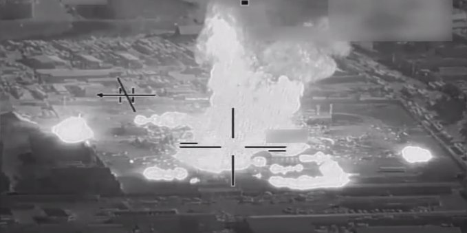 US-led coalition airstrike destroying what the DoD claims was an ISIS bomb factory in Mosul (Photo: Business Insider)