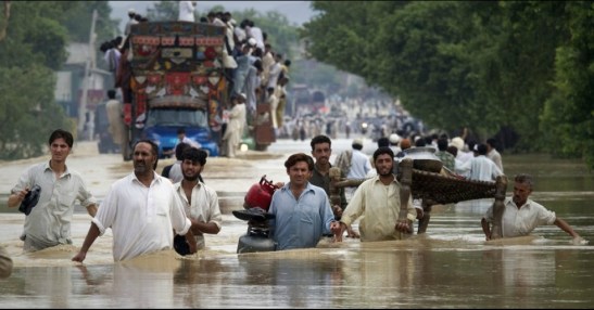 Flood victims in Pakistan making their way through waist-high waters in 2010. (Photo: AP)