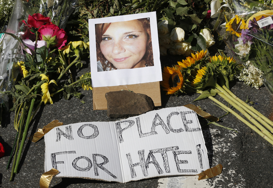 A makeshift memorial of flowers and a photo of the victim of the car attack is on display at the attack site in Charlottesville, Va., Sunday, Aug. 13, 2017. (AP Photo/Steve Helber)