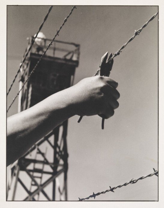 Blurred guard tower as backdrop. Holding cutters