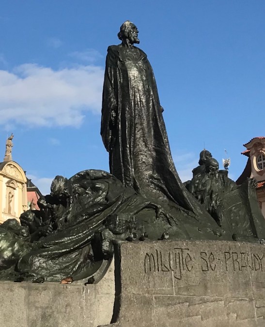Despite Prague’s glorious cathedrals, the Czech Republic may be the least religious country in the world; about 10 percent of people, according to polls, practice a faith, predominantly Christianity. Historically, this small nation’s struggle for independence can’t be separated from struggle for religious freedom, government divorced from Catholicism. A national hero and figure of inspiration through the 20th-century travails of Nazi-ism and the Soviet era is Jan Hus, priest, scholar and teacher, who in 1415, refusing to recant his democratic “heresies” about priestly privilege, burnt at the stake.
