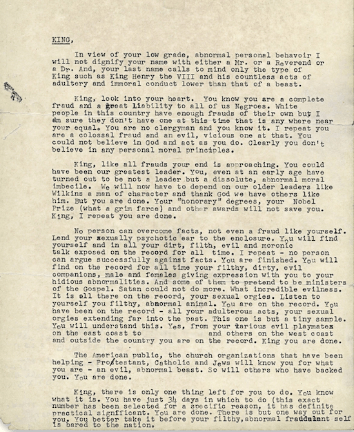 The anonymous letter was the result of the FBI’s comprehensive surveillance and harassment strategy against Dr. King, which included bugging his hotel rooms, photographic surveillance, and physical observation of King’s movements by FBI agents. The agency also attempted to break up his marriage by sending selectively edited “personal moments he shared with friends and women” to his wife.
