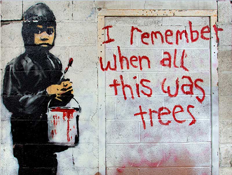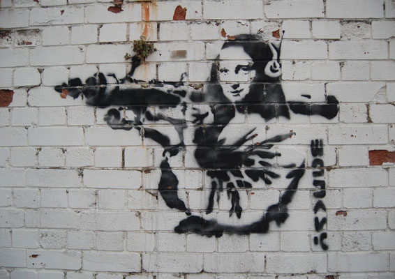 Banksy is an anonymous England-based street artist, vandal, political activist, and film director. His satirical street art and subversive epigrams combine dark humor with graffiti executed in a distinctive stenciling technique. His works of political and social commentary have been featured on streets, walls, and bridges of cities throughout the world. Banksy’s work grew out of the Bristol underground scene, which involved collaborations between artists and musicians. Banksy says that he was inspired by 3D, a graffiti artist who later became a founding member of the English musical group Massive Attack.