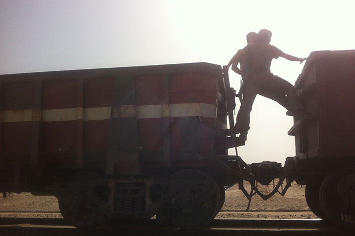 At 3-kilometers in length, trains on this line are among the longest and heaviest in the world. Passenger cars are sometimes attached to the train, but more often men opt to stow away atop the hopper cars, where daytime temperatures exceed 40°C. Death from falls is common.