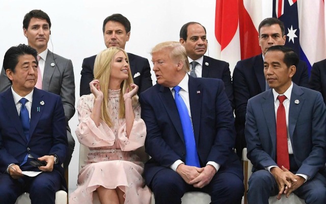 Because it’s not bad enough the G-20 summit in Osaka gave us Trump’s own mortifying blunders, North Korean photo-ops and gleeful “jokes” about killing journalists, we also got the “take-your-even-more-narcissistic-than-you-daughter-to-work” farce of Nepotism Barbie inexplicably turning up in flouncy pink at every event. The collective consternation of real-life leaders – AOC helpfully noted being someone’s daughter isn’t an actual qualification – was highlighted in a now-viral video released by the office of France’s Emmanuel Macron. It shows Ivanka excruciatingly struggling to join a conversation of grownups – Macron, Theresa May, Justin Trudeau, the IMF’s Christine Lagarde: They discuss social justice; she babbles male-dominated-lookit-this-purse-I-sell-non-sequiturs; they offer varying expressions of “tortured politeness” clearly revealing the subtext of the scene and the video release, as in, “WTF is this blonde moron doing here, and will someone please make her go away?”, with the visibly irritated Lagarde, in particular, looking like most of us. Confronted by such absurd kleptocracy, Twitter, as is its wont, got sweet revenge. Meet #Unwanted Ivanka, wherein the Princess of Clueless Complicity primps and prances, Zelig-like, through history. Because these days you gotta laugh or cry, though actually some of us do both.