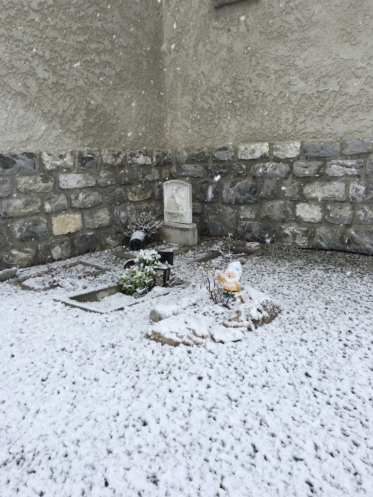 On my way home I stopped in at the Veyron church, where Rilke had sat in a pew to listen to the children’s choir practicing, and then went through the lych-gate behind it, because Rilke had said that whenever you come to a town you should visit the cemetery. I wandered through the rows of graves, reading the names of people who lived and died here. A few were children in Rilke’s time, and perhaps they knew him as he stepped into the church to listen to their song. Sheltered in a corner was the children’s cemetery: a handful of graves of those who died when they were two and five and ten years old; and another handful of tiny stone enclosures which held the bones of infants. One was graced with the stele of an angel. Another one had a smiling, snow covered garden gnome on it.