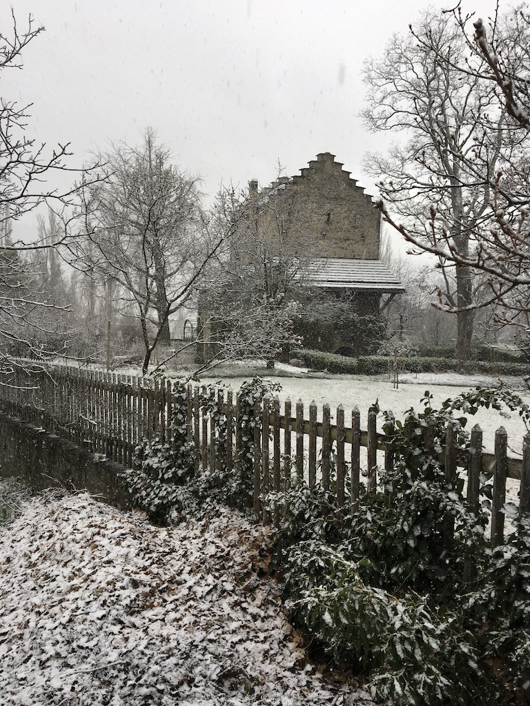 This morning the waiter told me over breakfast that the weather would be bad. “The Crows”, he nodded sagely, and as I looked at him with confusion, he explained that they fly low in the Sierre valley when the snow is moving in. And he was right. As I hiked up the mountainside through the barren vineyards large flocks of crows settled on the roofs of houses and black tree branches below. The mountains – Bella Lui, Mont Bonvin, Daubenhorn, Illhorn, and Six des Eaux Froides – were hidden in the fog. The clouds cleared only once in the distance to give me the sense that I was in the Alps, but quickly the bright light vanished and the snowflakes came down harder. At first, I felt sorry for myself that I went on this pilgrimage in the dead of winter. But then I remembered that this was exactly the time of year and the kind of weather that surrounded the Château de Muzot when, in February 1922, Rilke finished the Duino Elegies there and received the gift of all 55 Sonnets to Orpheus. On the day he was buried in Raron on a cold January afternoon in 1927, the peasant children who, according to local custom, stood in a circle around his grave with touching endurance, held up wreaths in hands blue with cold. Rilke was no stranger to the harshness of long winters: although Muzot sits in the balmy Valais that Rilke loved so much because it reminded him of Spain and Provence, it has withstood the terrible storms of alpine winters since the 13th century when it was built.