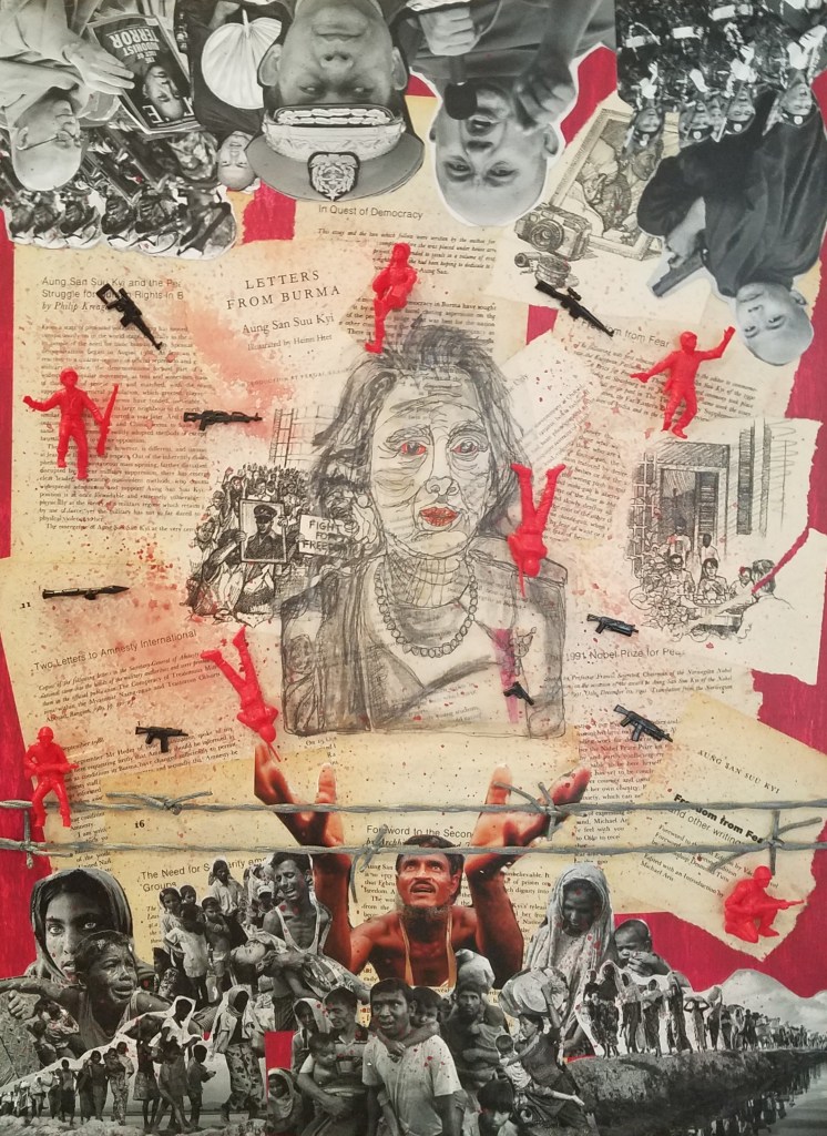 The foundation of the visual element is a pastiche of pages from her various books narrating her decades-long struggle for democracy which are matted upon a canvas, painted red. At the top of the piece is a collage of military and Buddhist clergy who are engaged in ethnically cleansing the country of the Rohingya. They are upside down to reflect their inverted morality. At the bottom of the piece is a collage of the Rohingya depicting their various precarities. The only color element is a picture of a Rohingya man, with an upturned face, begging for help. In the middle of the canvas is a contour sketch of Ms. Suu Kyi in which I have tried to destabilize her image as alluring. Scattered throughout the piece are images of soldiers and weapons reflecting the ongoing assault against these hapless peoples as well as barbed wire to reflect the ghettoization of Rohingya living in Myanmar.