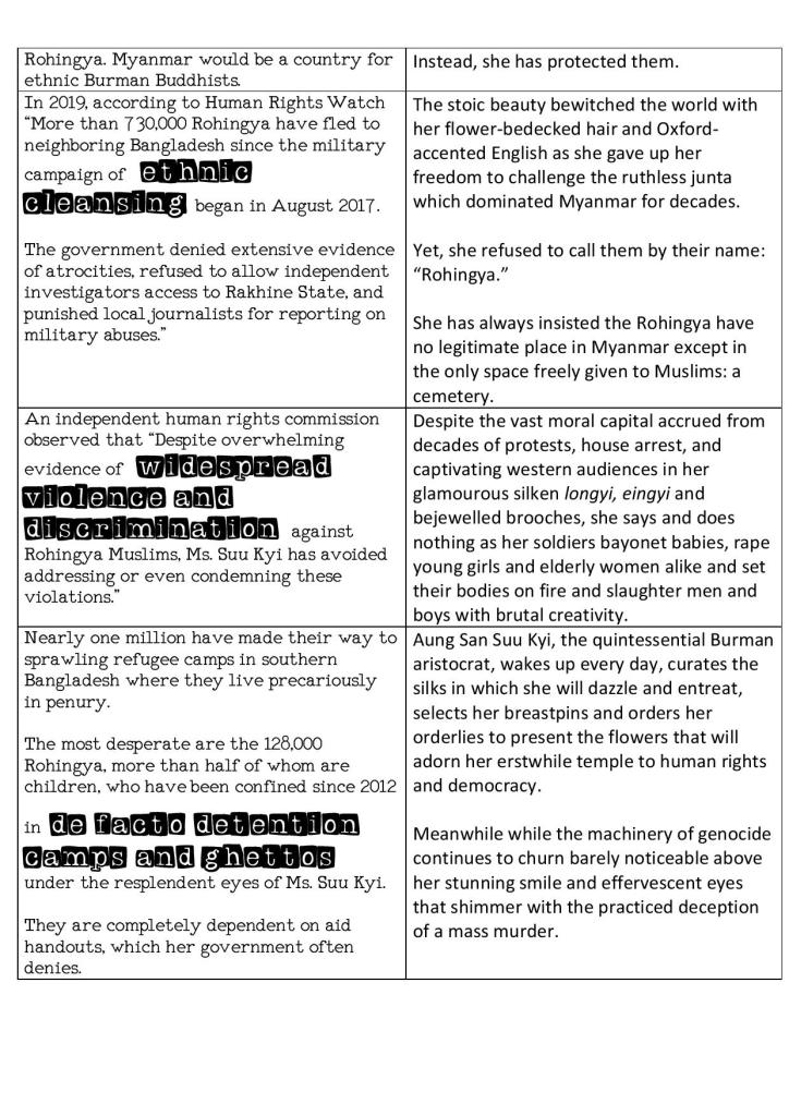 The accompanying narrative piece sets up a conversation between what the world expected of her since winning the Nobel Peace Prize and what she has done with respect to the Rohingya: remained complicit in this brutally comprehensive ethnic cleansing. The two sides set up a chronological dialogue of her rise to power and her concomitantly hardened stance against these people.