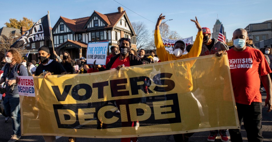 Demonstrators hold a Voters Decide banner highlighting the win for President-elect Joe Biden, declared on Nov. 7.  (Photo: Stephen Zenner/SOPA Images/LightRocket via Getty Images)