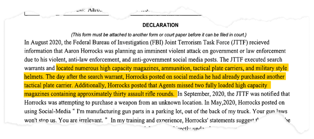 The bureau became alarmed in September 2020, when agents received a tip that Horrocks, who lives in Pleasanton, California, was “planning an imminent violent attack on government or law enforcement,” according to a petition to seize the man’s firearms, which was filed in state court in October. The investigation, which has not previously been reported, links Horrocks to the Boogaloo movement. He has not been charged.