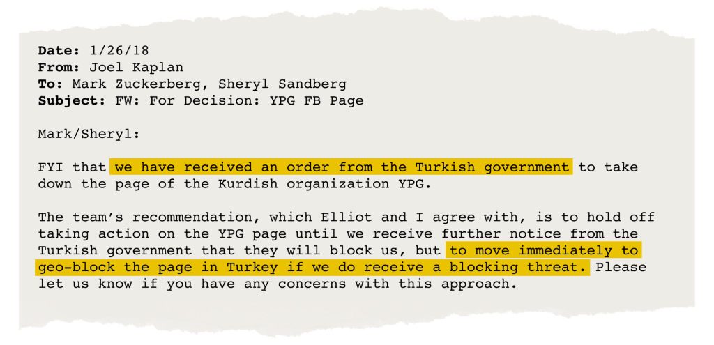“I am fine with this,” wrote Sheryl Sandberg, Facebook’s No. 2 executive, in a one-sentence message to a team that reviewed the page. Three years later, YPG’s photos and updates about the Turkish military’s brutal attacks on the Kurdish minority in Syria still can’t be viewed by Facebook users inside Turkey.
