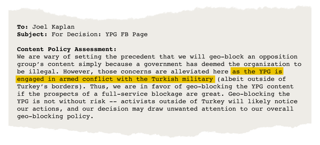In 2018, the review team, which included global policy chief Monika Bickert, laid out the consequences of a ban. The company could set a bad example for future cases and take flak for its decision. “Geo-blocking the YPG is not without risk — activists outside of Turkey will likely notice our actions, and our decision may draw unwanted attention to our overall geo-blocking policy,” said one email in late January.