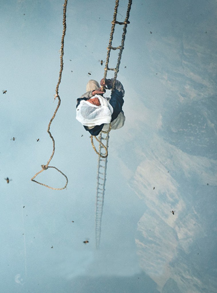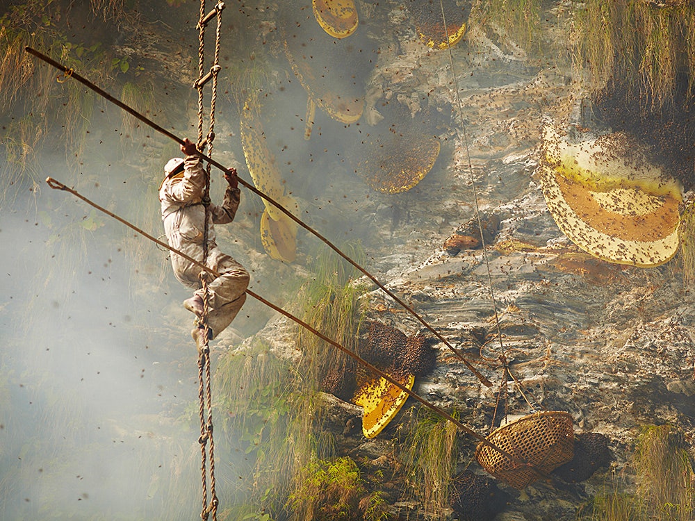 Made by the world’s largest honeybees, the honey is toxic, but its psychotropic properties have made it a traditional medicine in Kulung culture. Now, though, it also fetches high prices in Kathmandu and beyond, offering both much needed income for Dhan’s isolated village and putting external pressures on his gruelling work. At the same time, perhaps due to climate change or pollution, the bees are moving higher into the mountains, which means that Dhan and the team that helps him must trek ever further to harvest the honey.