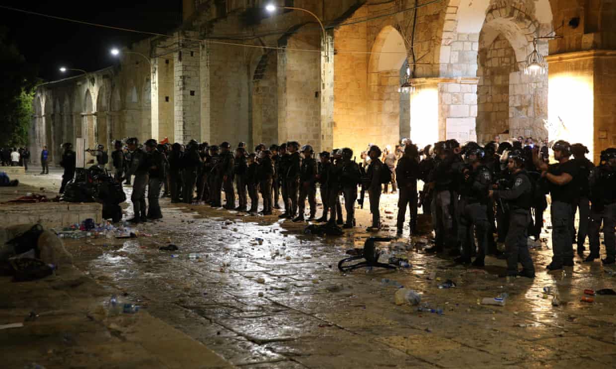 ‘Israeli forces have launched a series of violent assaults on unarmed protesters at al-Aqsa mosque in East Jerusalem. Israeli police outside the mosque on 7 May, 2021…. Over the past week, thousands of Palestinians have been gathering to pray at the al-Aqsa compound – one of the holy sites of Islam – in East Jerusalem, which has been occupied by Israel since 1967. But they have also been standing alongside the residents of Sheikh Jarrah, the neighbourhood from which numerous Palestinian families are facing eviction, in a move by Israel the United Nations has described as a possible war crime, given that it involves the transfer of “an occupying [power’s] civilian population into the territory that it occupies”’. (source: The Guardian)