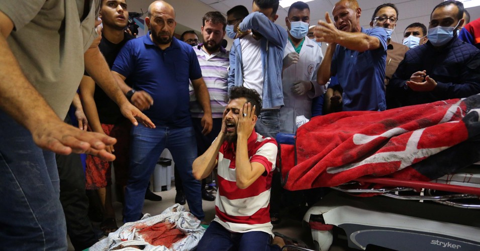 Relatives mourn next to the bodies who were killed in Israeli attack carried out to the home of Palestinian Abu Khatab Family living in Al-Shati Camp in Gaza Strip, at the morgue of Shifa Hospital on May 15, 2021, in Gaza City, Gaza. 7 people, including 5 children, 2 women killed in Israeli attack on Gaza Strip. (Photo: Ashraf Amra/Anadolu Agency via Getty Images)