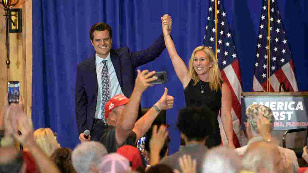 (Below) Rep. Matt Gaetz, R-Fla., left, and Rep. Marjorie Taylor Greene, R-Ga., raise their arms after addressing attendees of a rally, Friday, May 7, 2021, in The Villages, Fla. (AP Photo/Phelan M. Ebenhack)