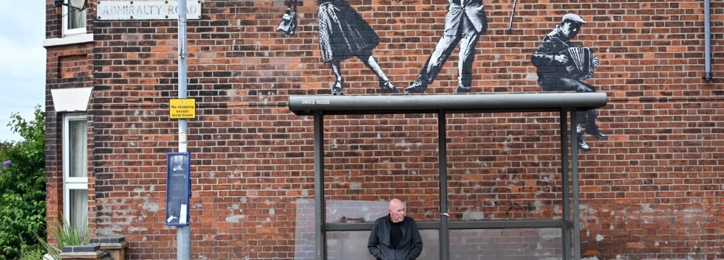 A man waits at a bus stop below graffiti art by Banksy on a wall in Great Yarmouth, one of several new works from his road trip in seaside towns portrayed in “A Great British Spraycation.” Photo by JUSTIN TALLIS/AFP via Getty Images