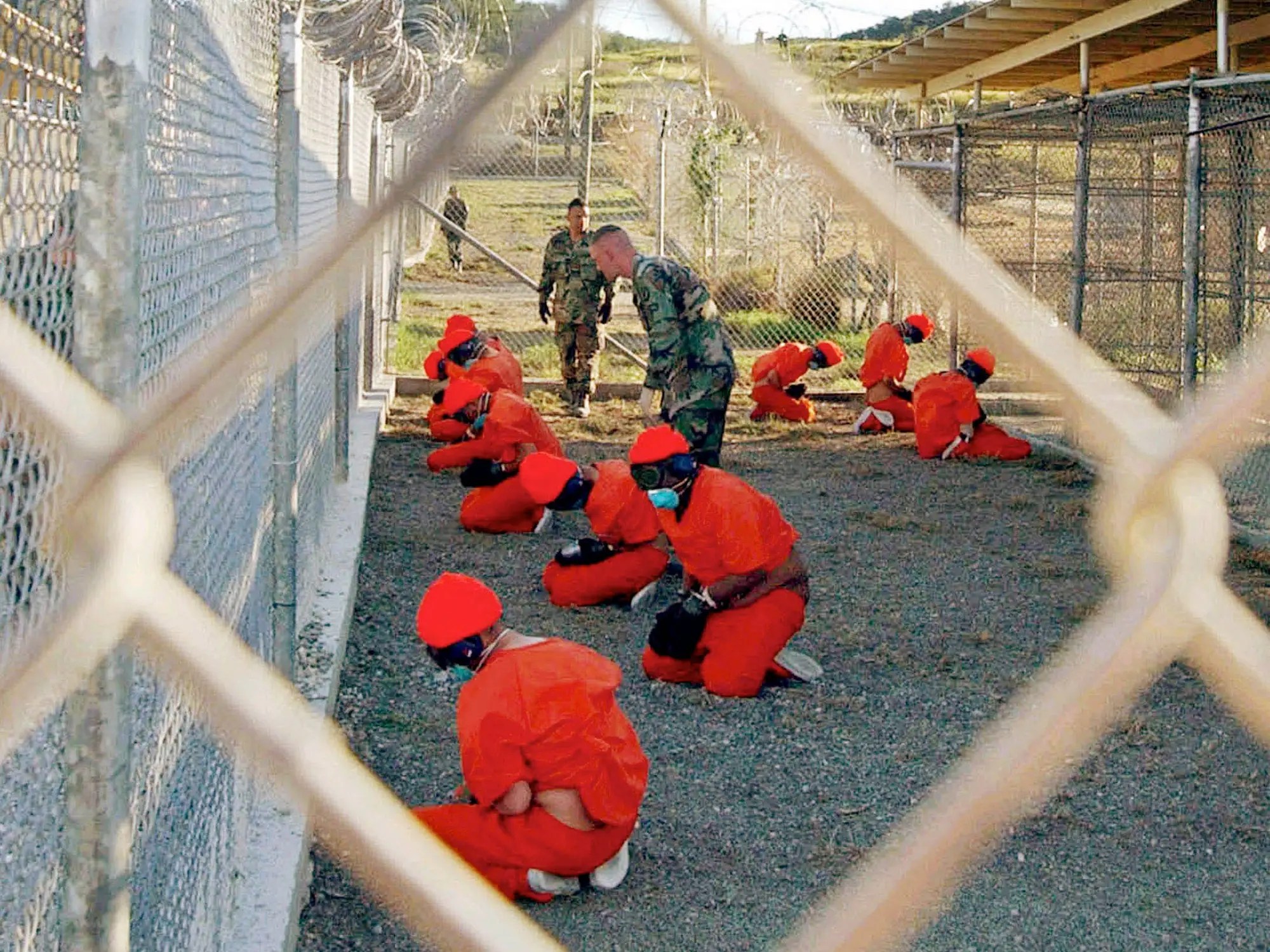 Detainees sitting in a holding area watched by military police at Camp X-Ray inside Naval Base Guantanamo Bay, Cuba. Petty Officer 1st class Shane T. McCoy/US Department of Defense Handout via Reuters