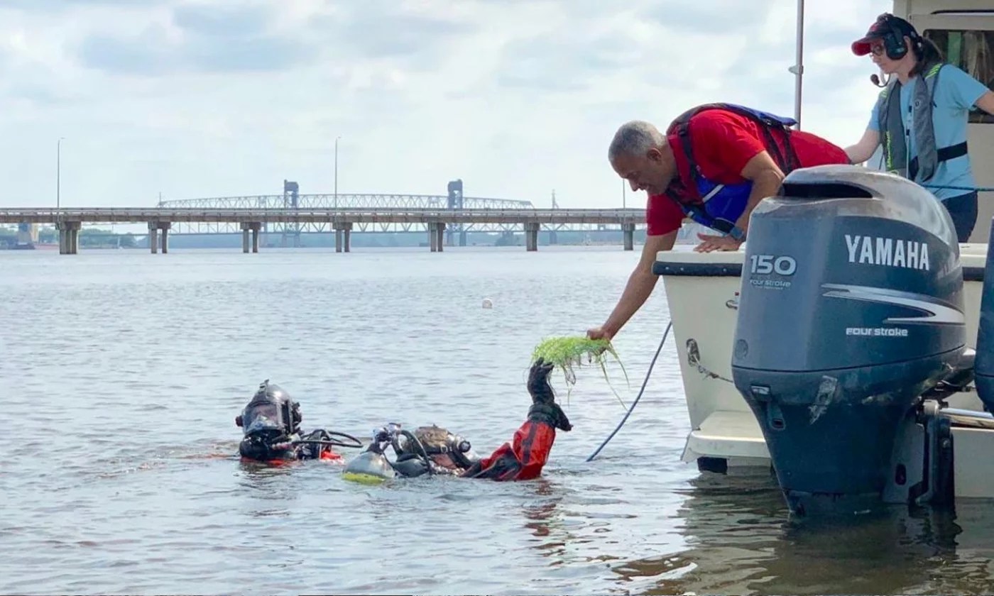 On a recent summer morning near Camden, New Jersey, two divers from the U.S. Environmental Protection Agency (EPA) hovered over a patch of sediment 10 feet below the surface of the Delaware River. With less than 2 feet of visibility in the churning estuary, they were transplanting a species crucial to the ecosystem: Vallisneria americana, or wild celery grass. One diver held a GoPro camera and a flashlight, capturing a shaky clip of the thin, ribbon-like blades bending with the current.