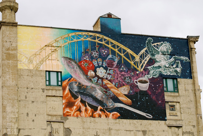 THE GUSTATORY: A mural by Sandy Kessler Kaminski welcomes visitors to the Strip District, the epicurean center of Pittsburgh.