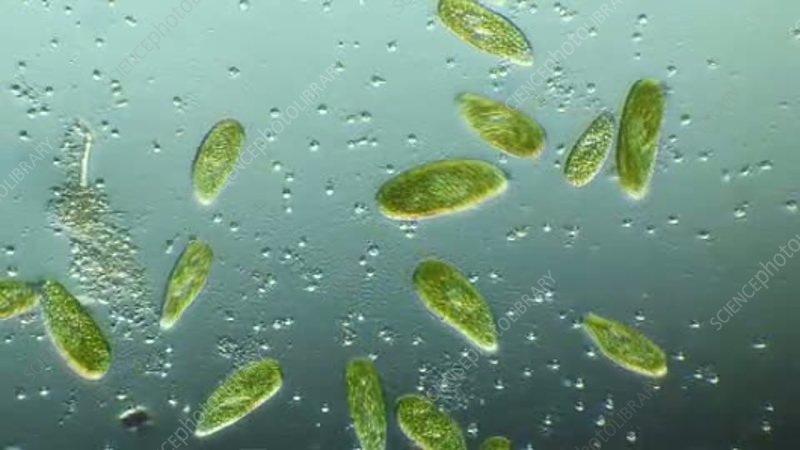 Paramecium bursaria, ciliated protozoans measuring about 150 microns in length, swimming about in pond water. Credit: Peter Matulavich / Science Photo