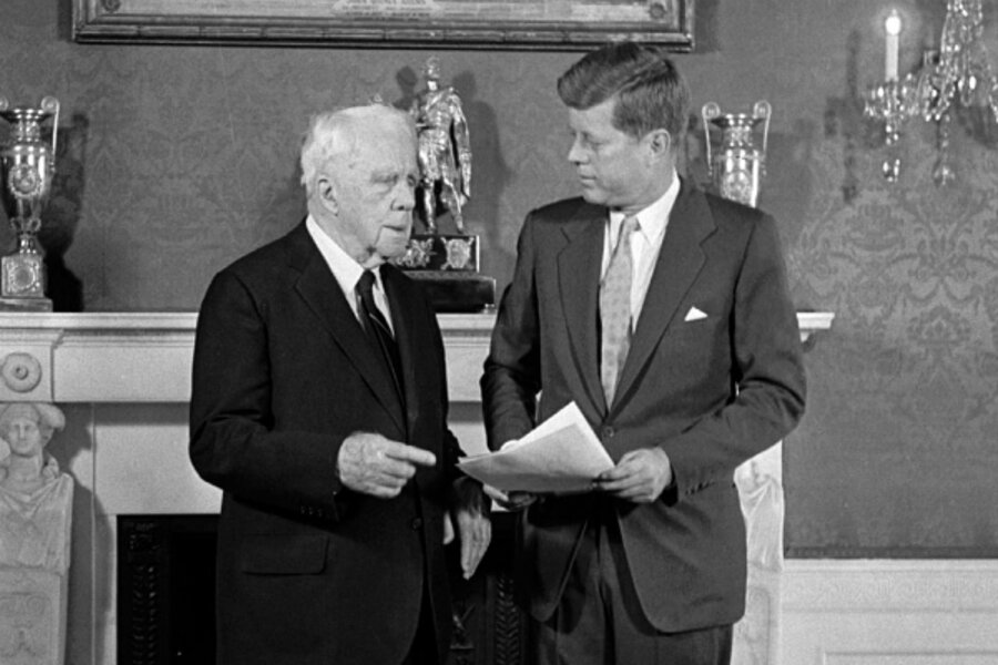President Kennedy and Robert Frost chat in the Green Room of the White House.