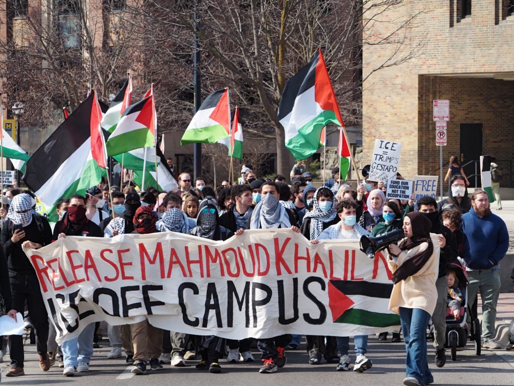 Pro-Palestinian protestors gather on University of Michigan’s Ann Arbor campus on March 14, 2025 to call for the release of Columbia University organizer Mahmoud Khalil. Photo: Anna Liz Nichols