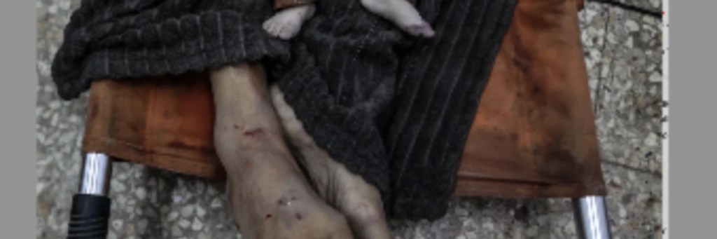 Lest we forget, the carnage has descended onto an already decimated medical infrastructure of ravaged hospitals, meager or non-existent supplies, and surviving, overwhelmed health workers, almost all of whom have, while on duty, seen loved ones arrive dead or grievously wounded in the E.R’s. of their gutted hospitals. This week, they recounted more horrors: “We received many bodies and body parts, most of them children and women…many burned head to toe (with) limbs and heads missing.” Seven girls were getting their legs amputated, without anesthesia or sedation: “The screams were everywhere.” Doctors collapsing, crying, “the smell of burnt flesh in their noses.” A 29 year-old woman with hideous wounds – sacrum, rectum, bladder, colon – who died; she was the sister of a doctor. A six-year-old child with shrapnel wounds in his chest and abdomen, two holes in his heart, a laceration in his left lung, a liver split in half, two holes in his colon, three holes in his stomach, five holes in his small bowel. Reported one doctor, “He did not survive.”