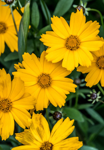 black-eyed Susans, Stella d’Oro lilies. At night,