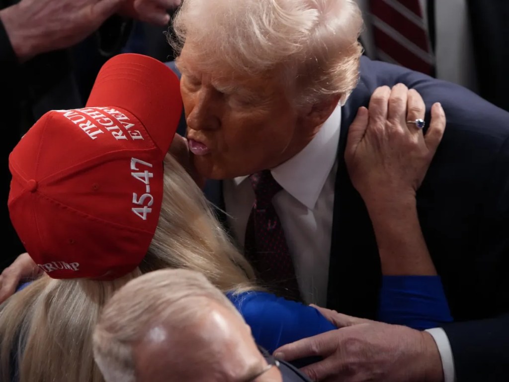 The Blob is back,” quipped Stephen M. Walt of Foreign Policy magazine about Trump’s chaotic decisions driven by personal greed. In this photo, Trump is seen kissing Marjorie Taylor Greene at a campaign rally.