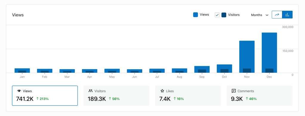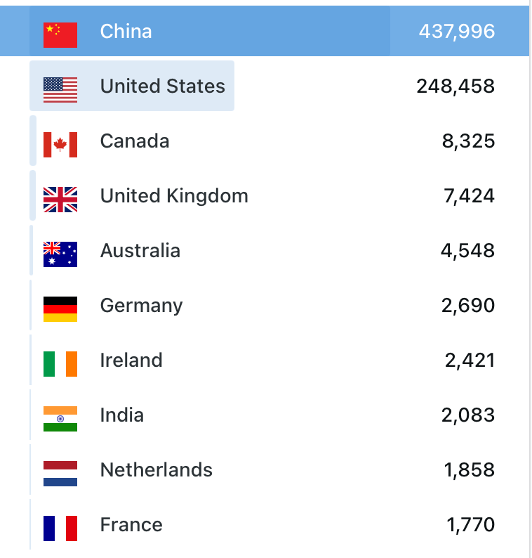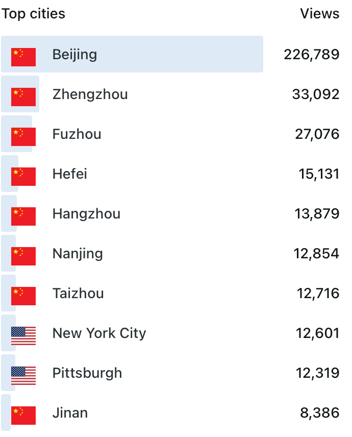 Since mainland China blocks virtually all western media, I was surprised a few months ago (following the appearance in New World Poetry of seven of my poems translated into Mandarin by Professor Ma Yongbo) when a flood of visitors from China began clicking onto my poems and essays in Vox Populi. Thankfully, interest spread to better poets such as Laure-Anne Bosselaar, Rosemerry Wahtola Trommer, Donna Hilbert and Ma Yongbo himself, as well as many others. Here’s a chart showing the growth in Vox Populi’s readership in 2025: