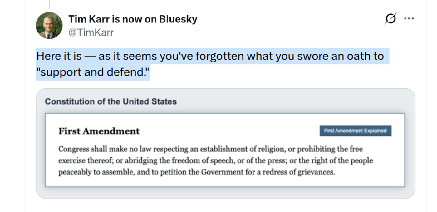 Free Press senior director of strategy and communications Timothy Karr responded to Carr with a screenshot of the First Amendment and the words: “Here it is—as it seems you’ve forgotten what you swore an oath to ‘support and defend.’”