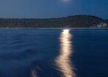 Boats tipped with light and moon on the water.